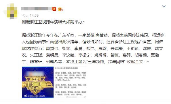 距离2020年只剩下最后一周,对于各大电视台来说,如今迫在眉睫的事情就是跨年演唱会的收视大战。十二月以来,芒果台、东方卫视、江苏卫视已经陆陆续续官宣了大量嘉宾阵容,但是处于风口浪尖的浙江卫视迟迟没有动