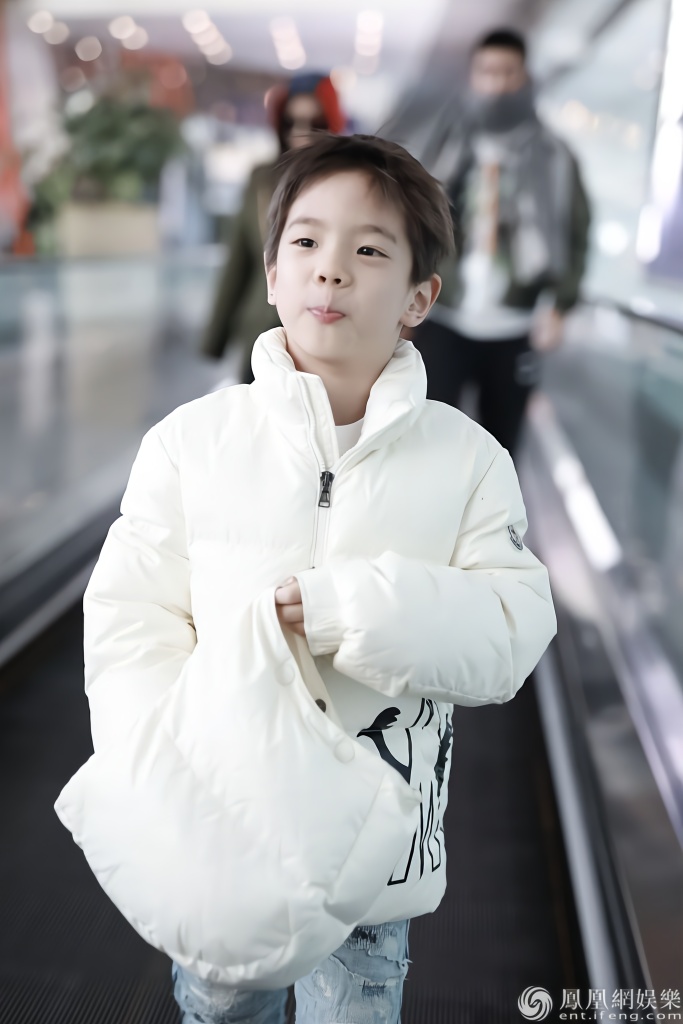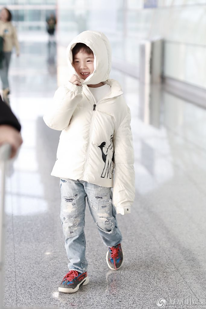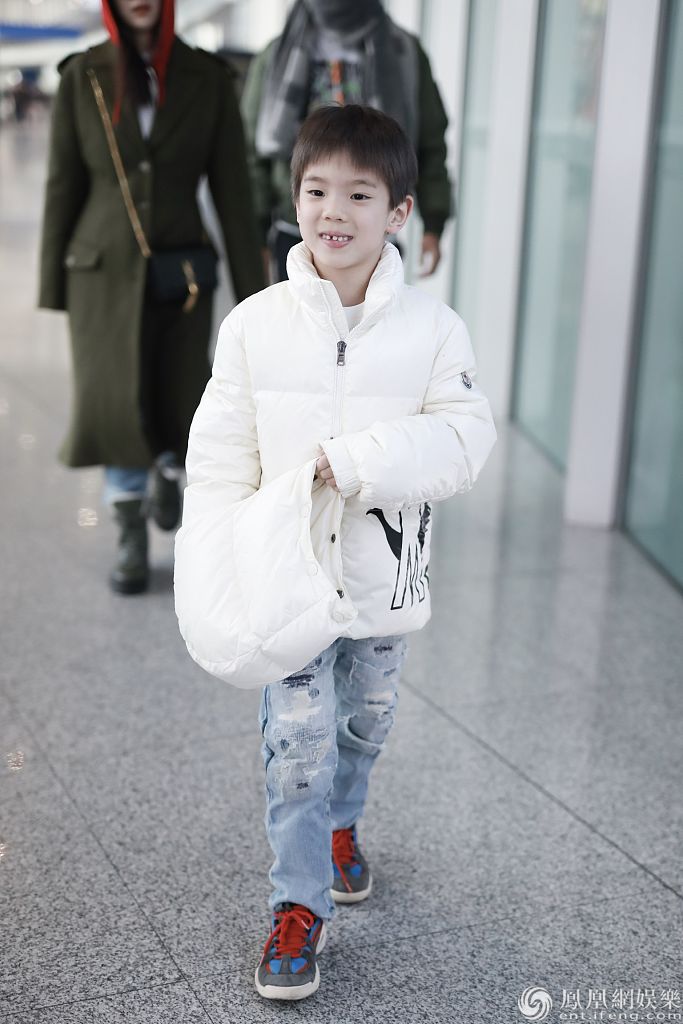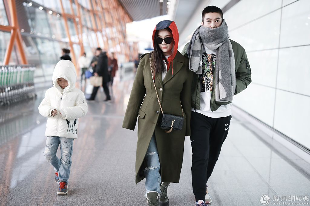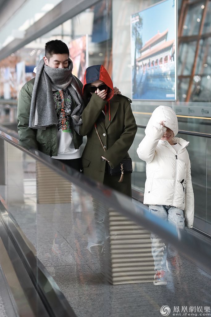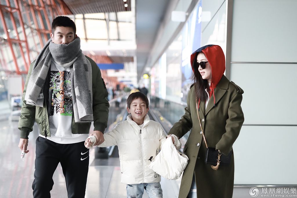 2019年12月25日,北京,霍思燕、杜江和儿子嗯哼现身机场。霍思燕戴红色帽子穿军绿色大衣,与杜江手牵手恩爱甜蜜。嗯哼穿白色上衣,摘下上衣帽子遮脸玩耍十分可爱,6岁的他门牙掉了一颗,十分呆萌讨人