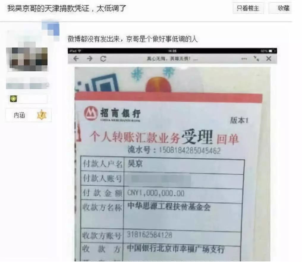 汶川地震、雅安地震、天津港爆炸等灾难中,他都有捐款。其中天津港那回捐款,连个微博都没发。