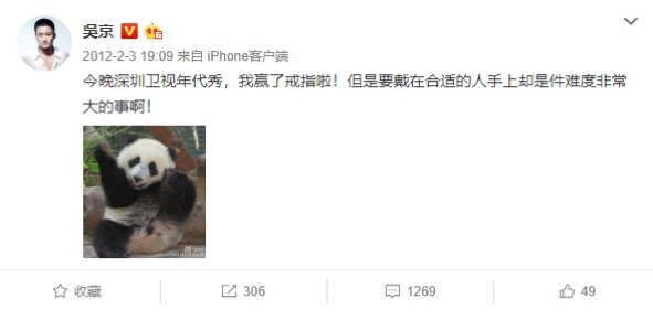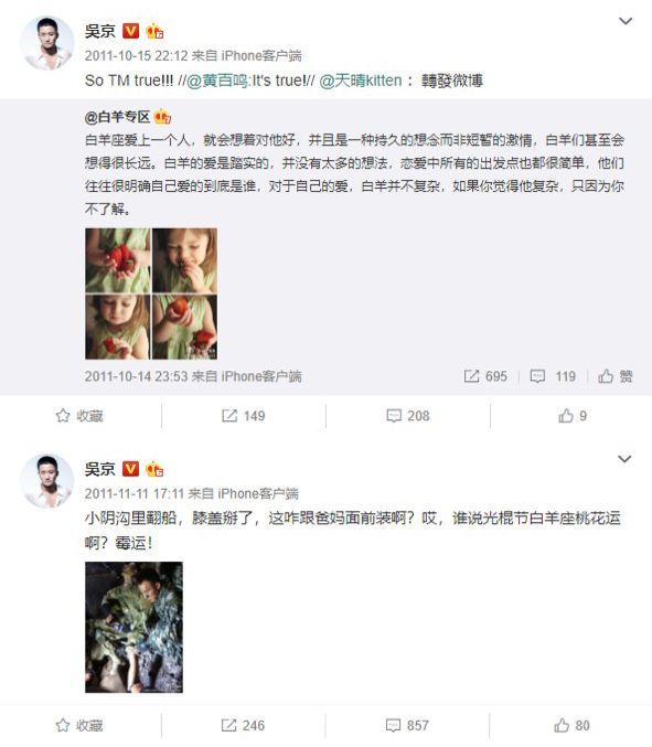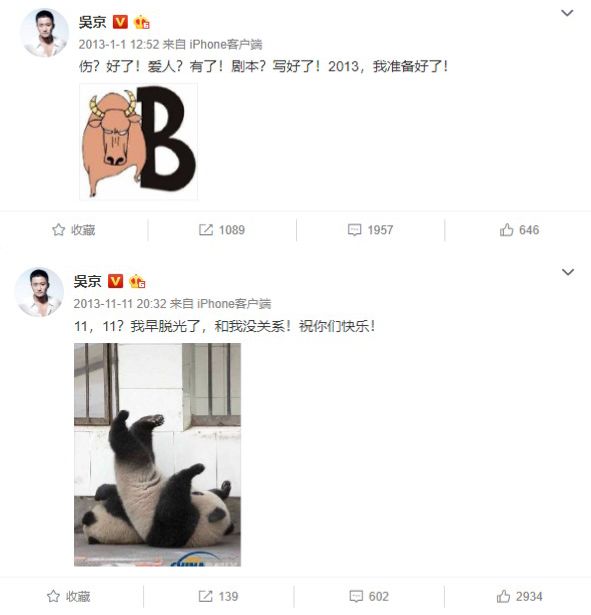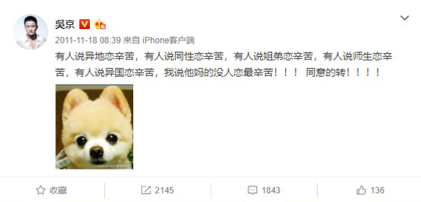 2011年那会,吴京的微博几乎就是他饥渴指数的K线图,基本每个月都有一条渴望脱单的微博发出。