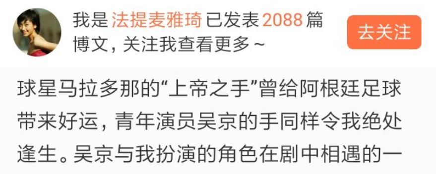 法提麦·雅琦在文中,把吴京的举动和马拉多纳的上帝之手联系在一块。吴京的救命之恩,到现在她都记忆犹新。