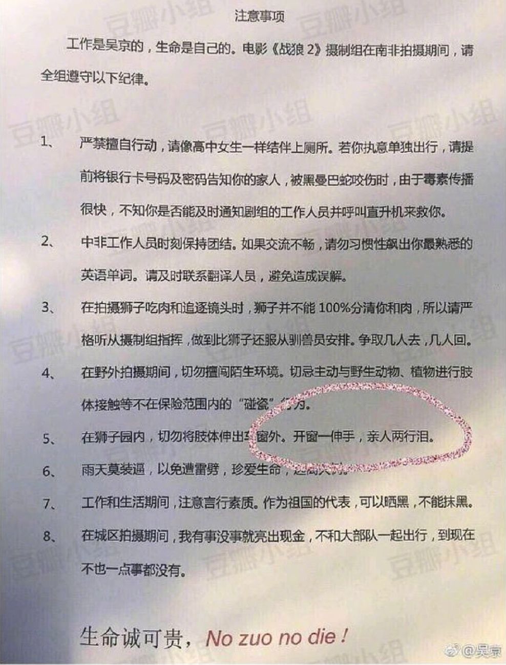 别看守则里用的都是“工作是吴京的,生命是自己的”这种戏谑的语气,,但往深了看,条条框框内都是为了提醒剧组人员们尽可能地保护自己的人身安全。