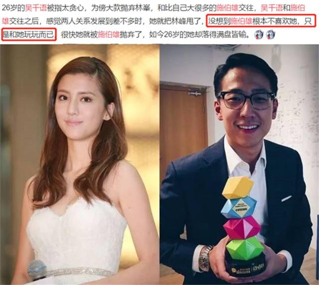 吴千语当年在和林峯分手没多久,就火速搭上富家子弟施伯雄,俩人经常出双入对与友聚餐,甚至一起出国度假,不过施伯雄一直没有承认吴千语是自己的女朋友,据悉因为无法获得身份,千语BB伤心欲绝,二人在今年3月被曝分手。