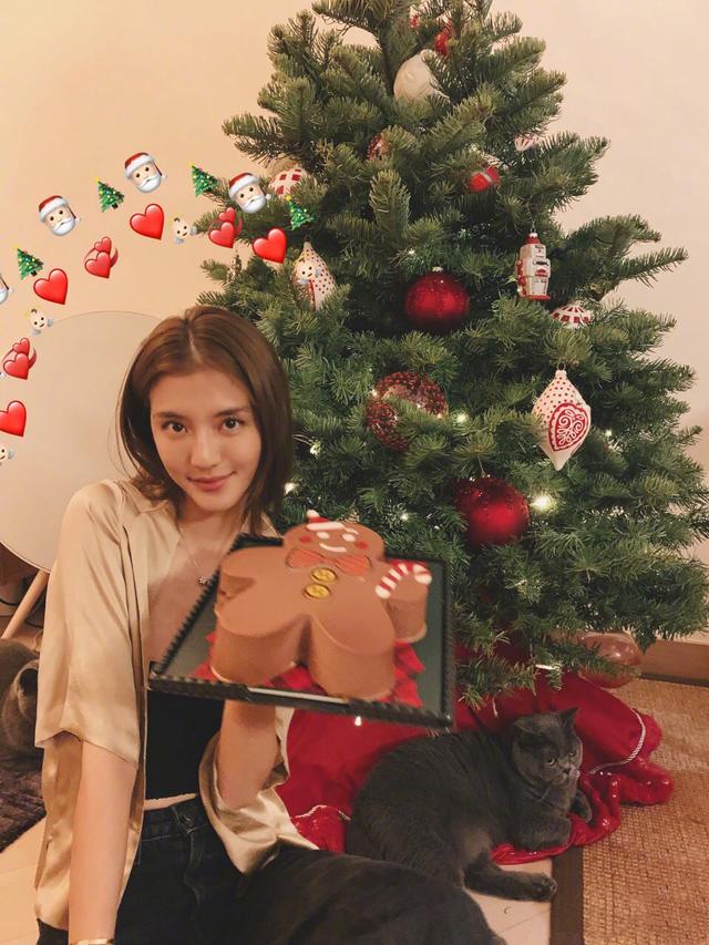 吴千语的家中摆了一颗圣诞树,布置的丰富漂亮,仪式感十足。女神手中还捧着一个巧克力蛋糕,可爱的小人形象,头戴圣诞帽,手拿彩色小拐杖,应该是她亲手做的吧!