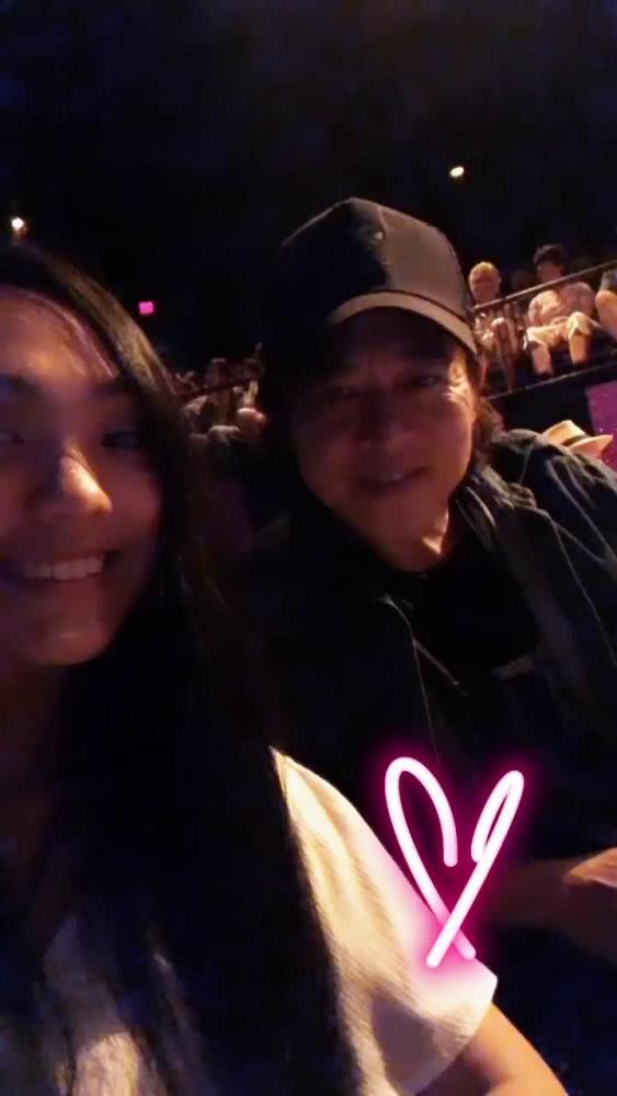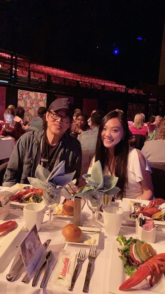 照片中,李连杰戴着帽子坐在女儿身后,父女俩望着镜头笑容满面。