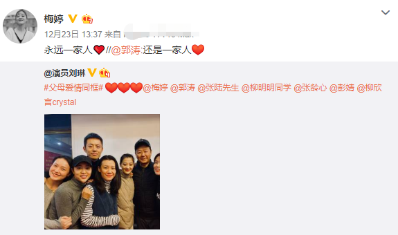 稍晚,该剧的主演梅婷和郭涛则纷纷转发该动态,并暖心留言:“永远一家人”“还是一家人”。