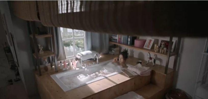 住宅却位于北京繁华地段、全精装小复式、外有落地玻璃窗、内配榻榻米大浴缸的搭景。