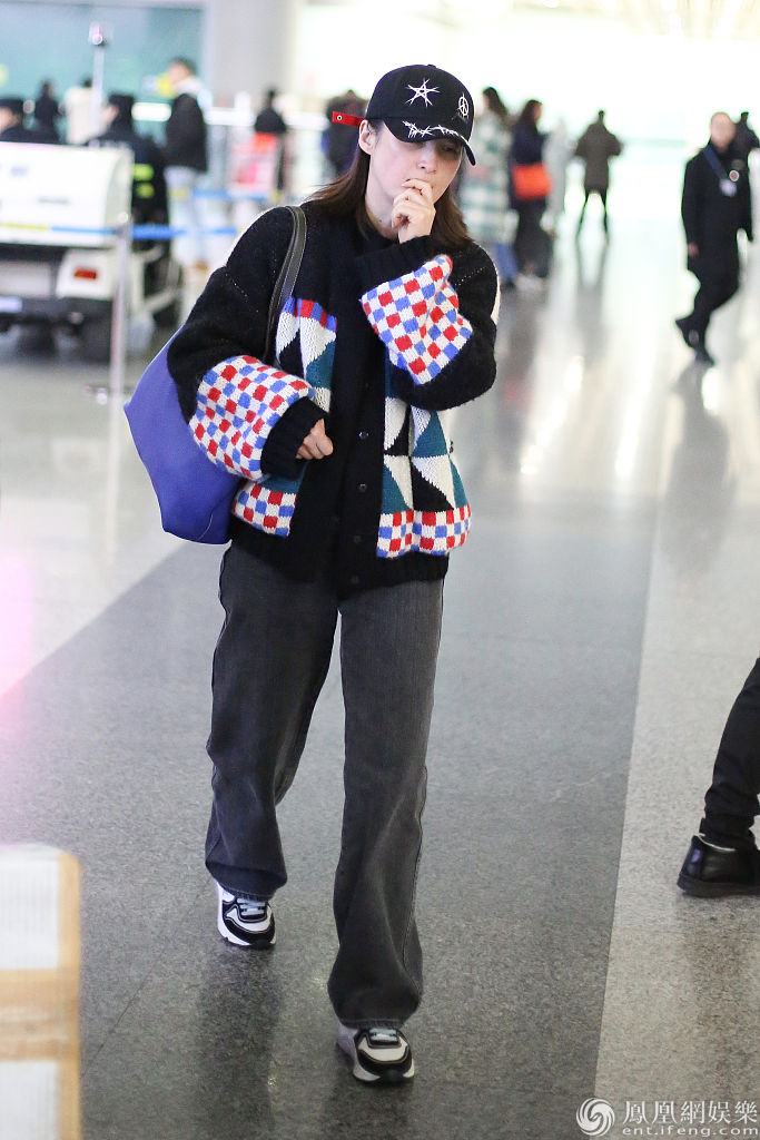 蒋勤勤身穿拼色毛衣和宽松长裤造型非常休闲。