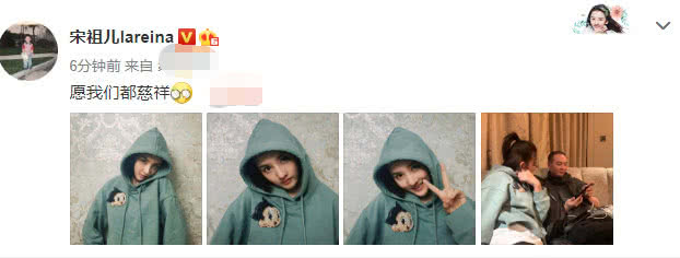 12月23日,宋祖儿在个人社交账号晒出几张穿着绿色卫衣的美照,同时还晒出了与父亲坐沙发上玩手机的照片,并配文:“愿我们都慈