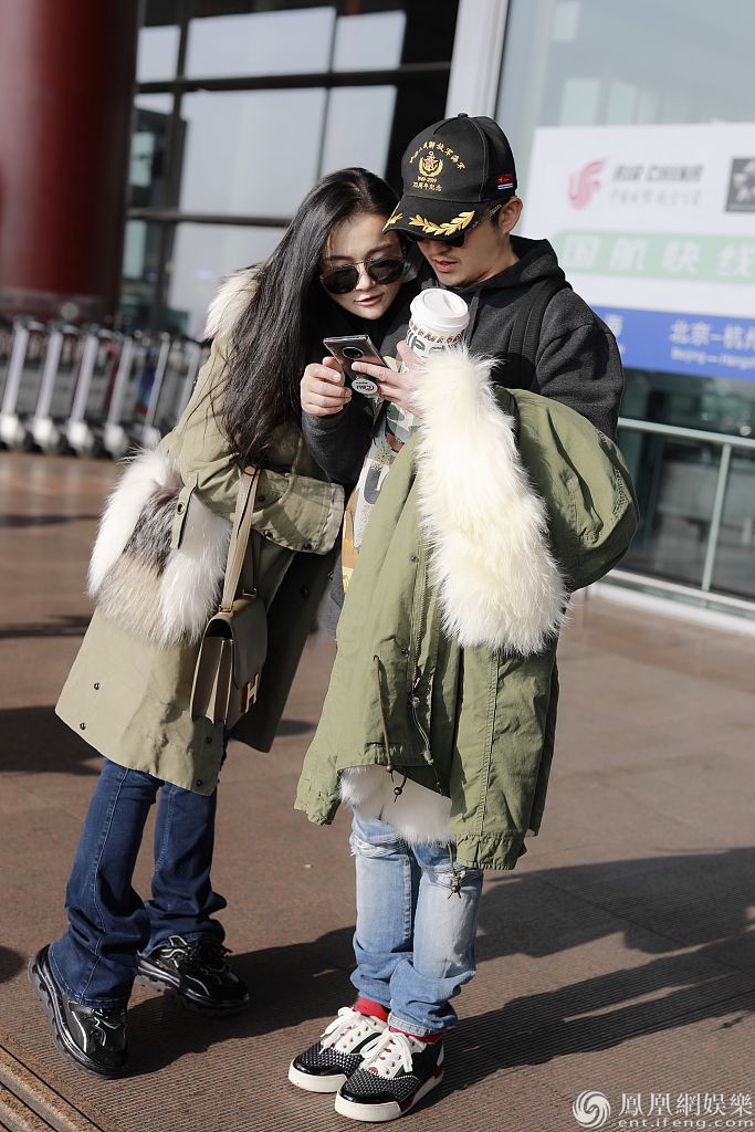 夫妻二人合体现身,装扮十分休闲保暖, 两人低头看手机超专注。