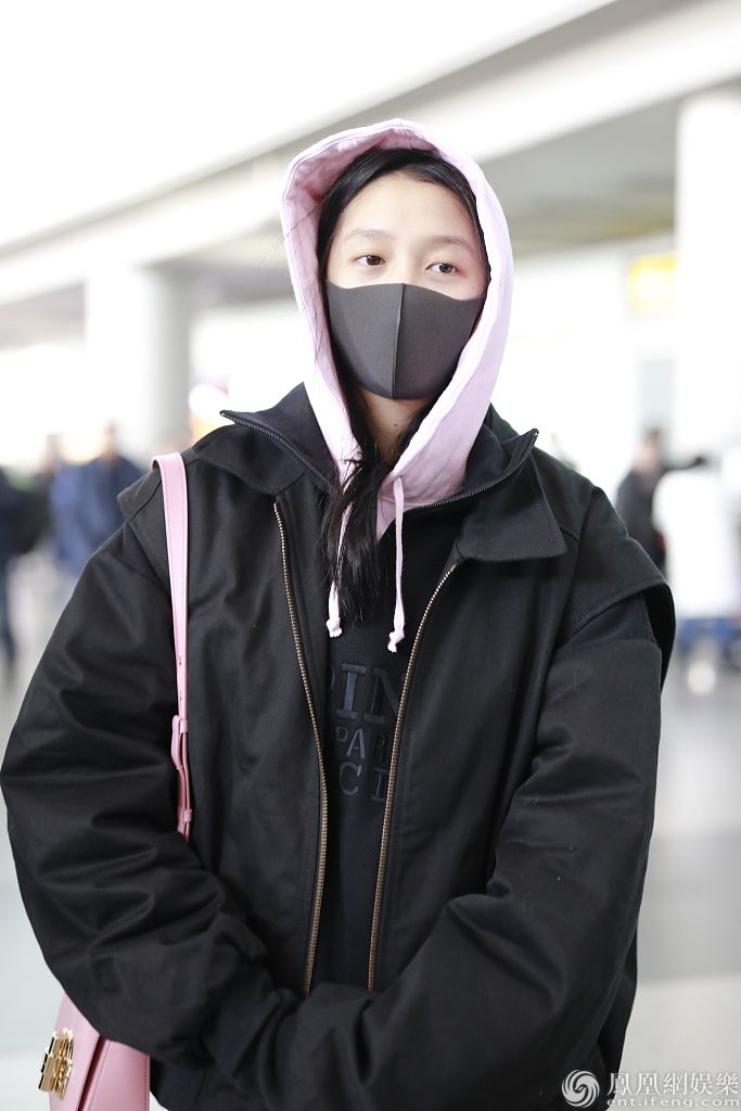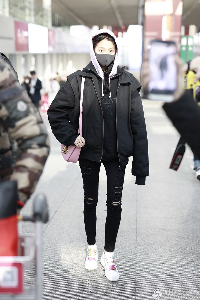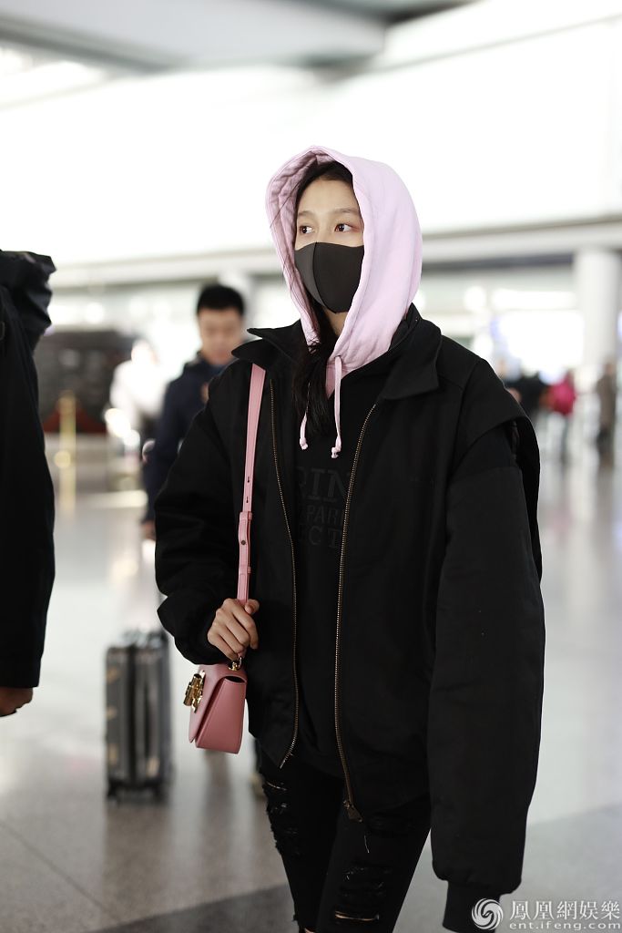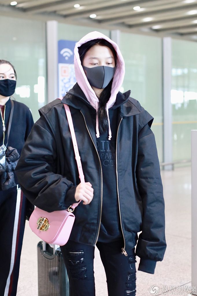 她全黑look搭粉卫衣霸气不失可爱, 对镜大方招手露水灵大眼睛。