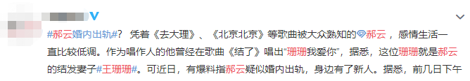 12月23日一早,有媒体曝光知名民谣歌手郝云疑似婚内出轨。当天郝云和一位气质美女一同逛街,两人手牵手恩爱满