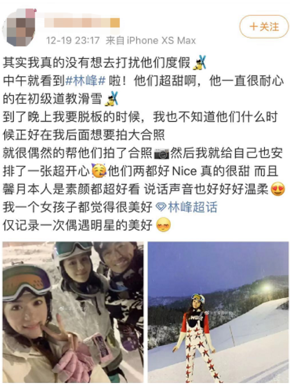 近日,有网友在滑雪场偶遇了张馨月和林峯并晒出了合照,发文表示二人的互动十分甜蜜,林峯一直在初级滑道教张馨月滑