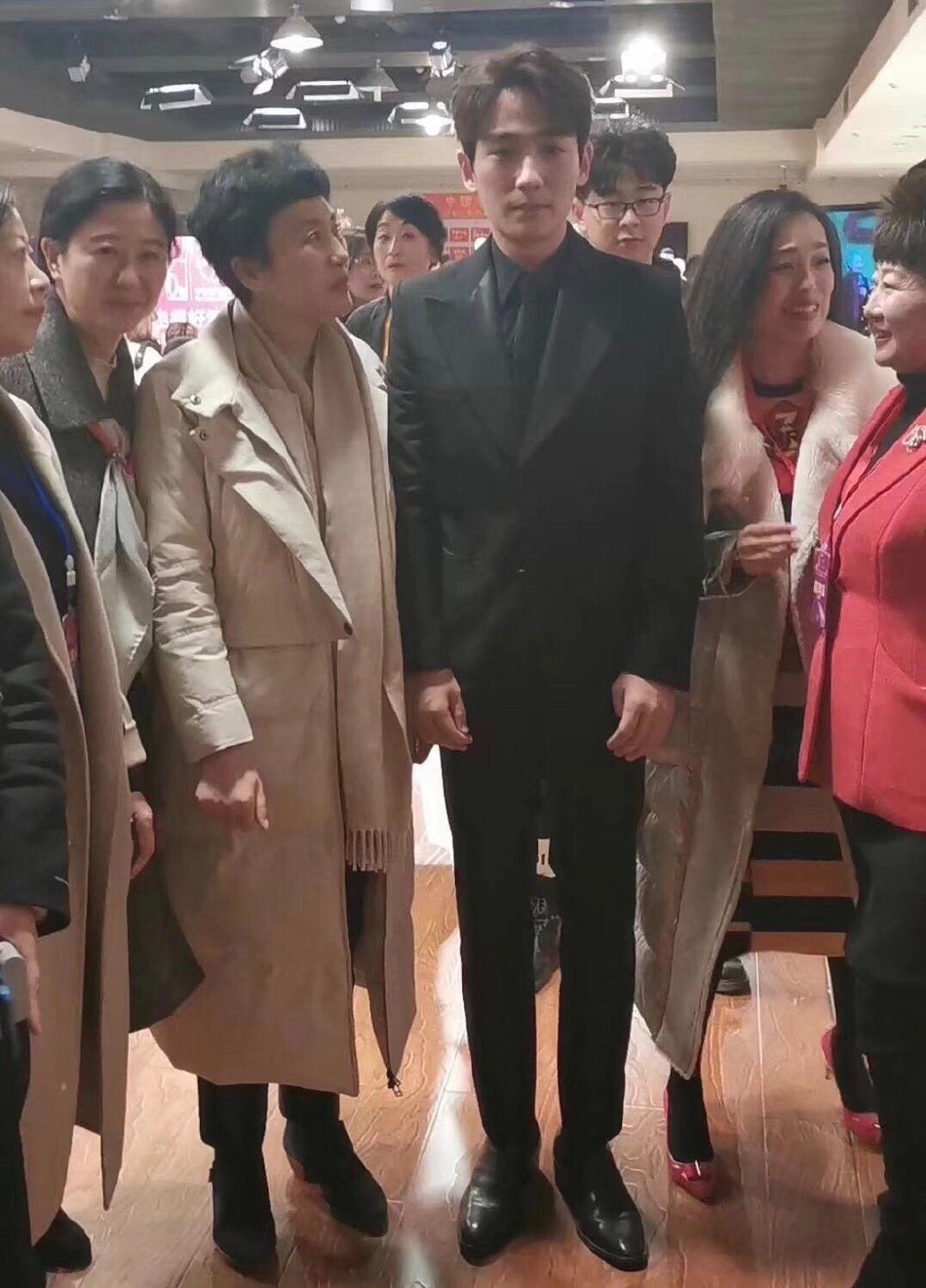 图中的朱一龙被几位阿姨粉丝围在中间,站定不动,表情保持微笑,显得呆萌可爱。