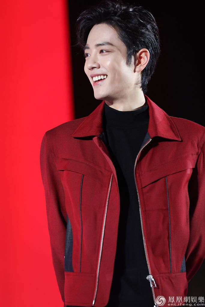 肖战身穿红外套对镜甜笑帅气有型,不时抿嘴变表情包,举手投足尽显反差萌。