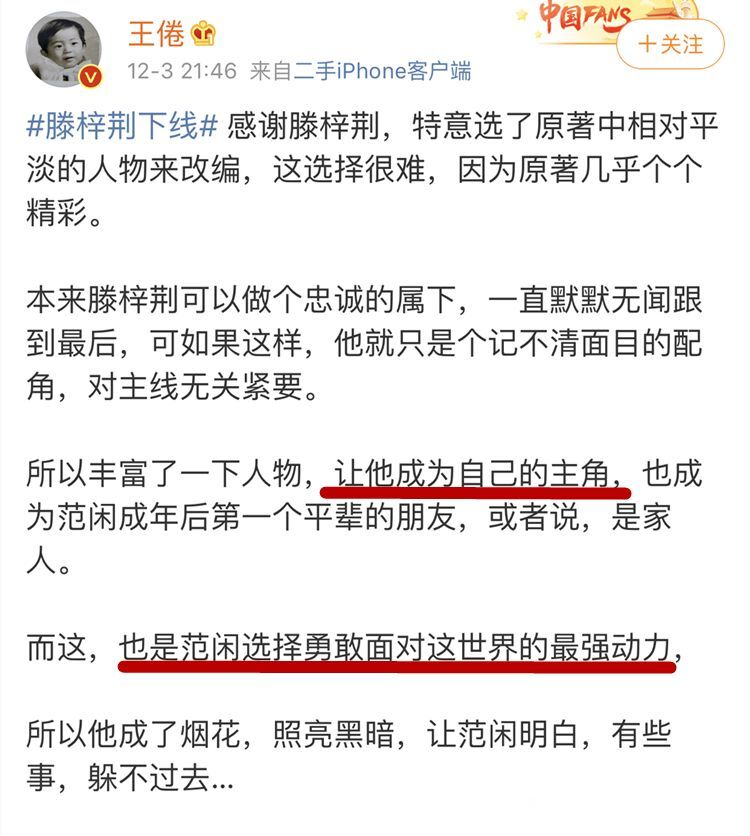 看的出来,王倦是一个尊重原著,同时也很有自己想法的编剧。