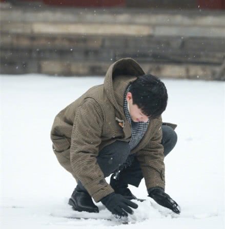 邓伦开心堆雪人。