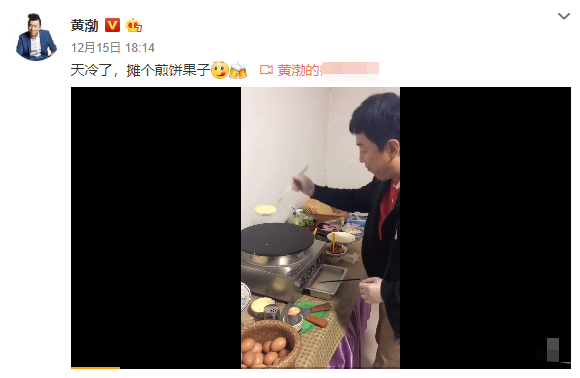 12月15日晚,黄渤在网络上分享一则摊煎饼果子的视频,并配文写道:“天冷了,摊个煎饼果子!”对于自己的操作,黄渤自称摆摊的时候练过,非常的逗趣。