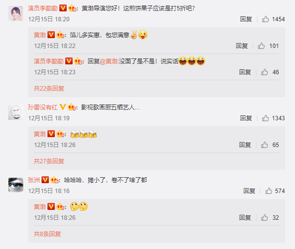 同时,黄渤还在留言区自卖自夸的和演员李勤勤互动道:“馅儿多实惠,包您满意!”