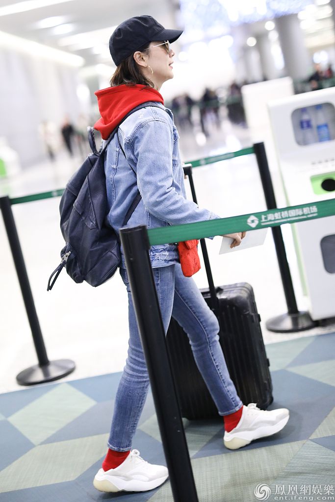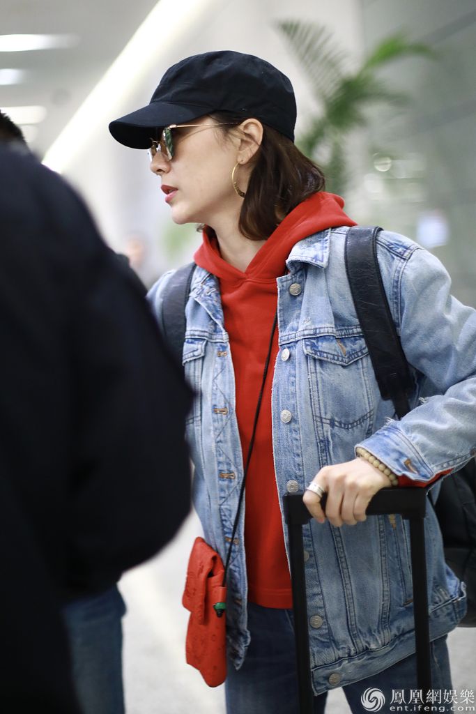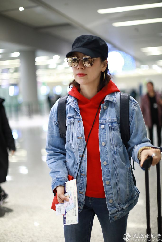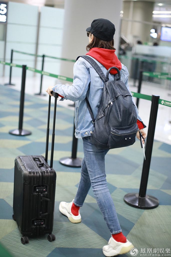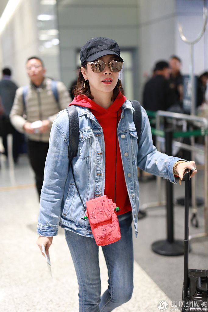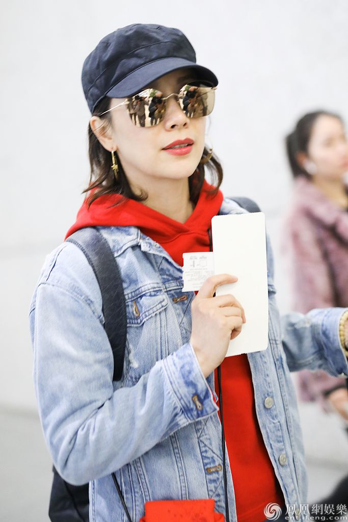 她戴帽墨镜遮面涂红唇尽显肤白貌美,气质绝佳,红蓝造型一展清新时尚魅力,十分靓丽。