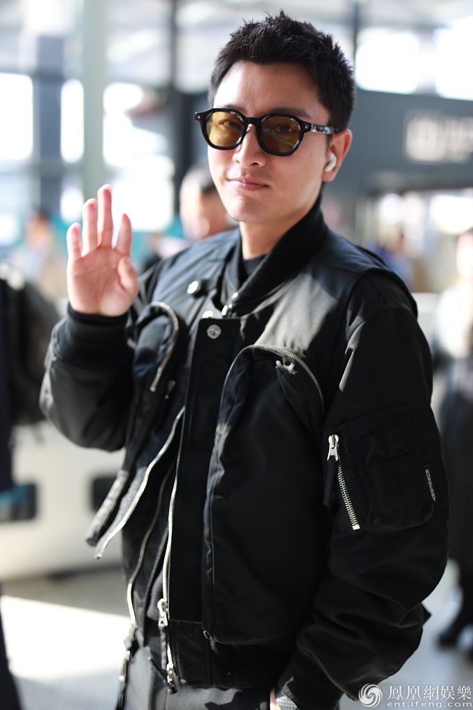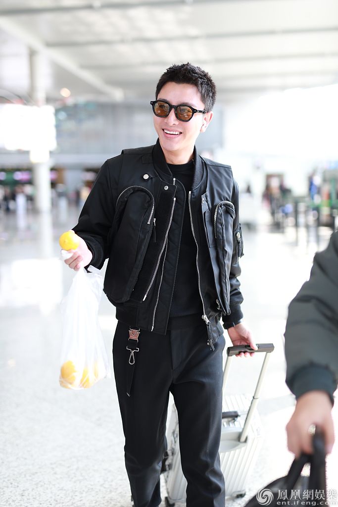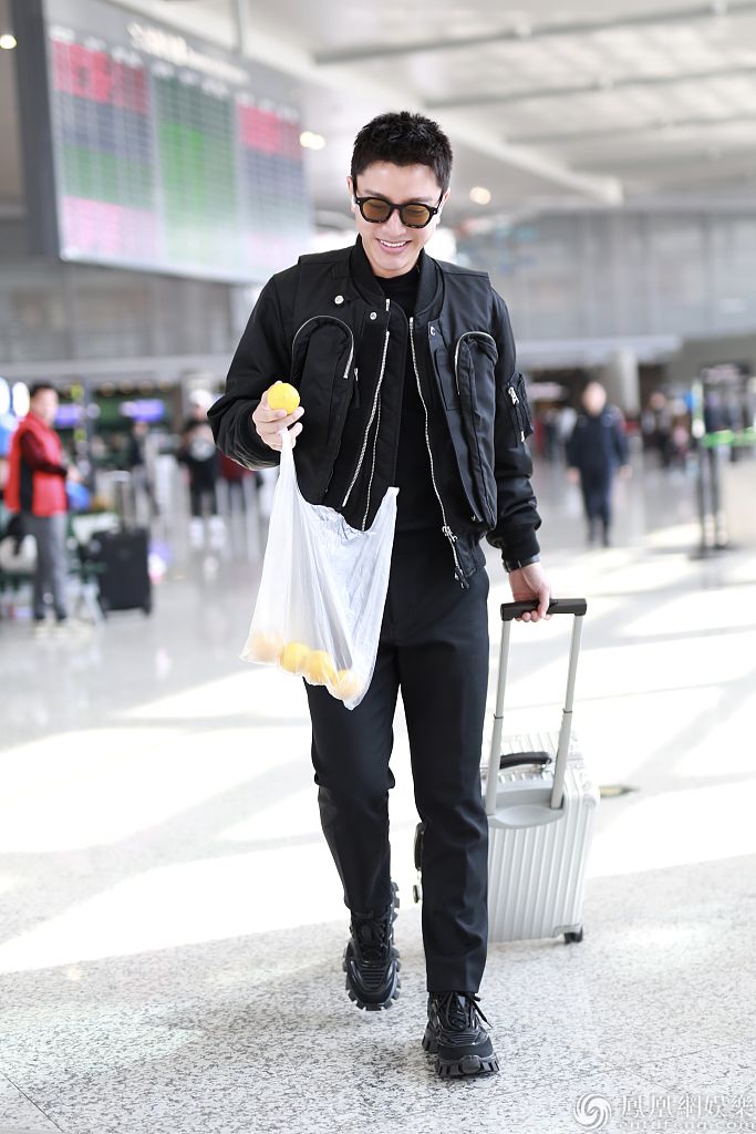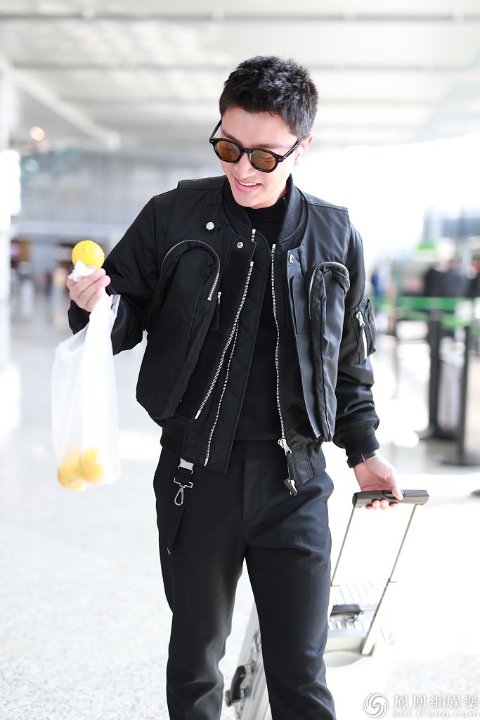 离婚后的他一改早前嘻哈潮流装扮,架墨镜全黑look帅酷有型。