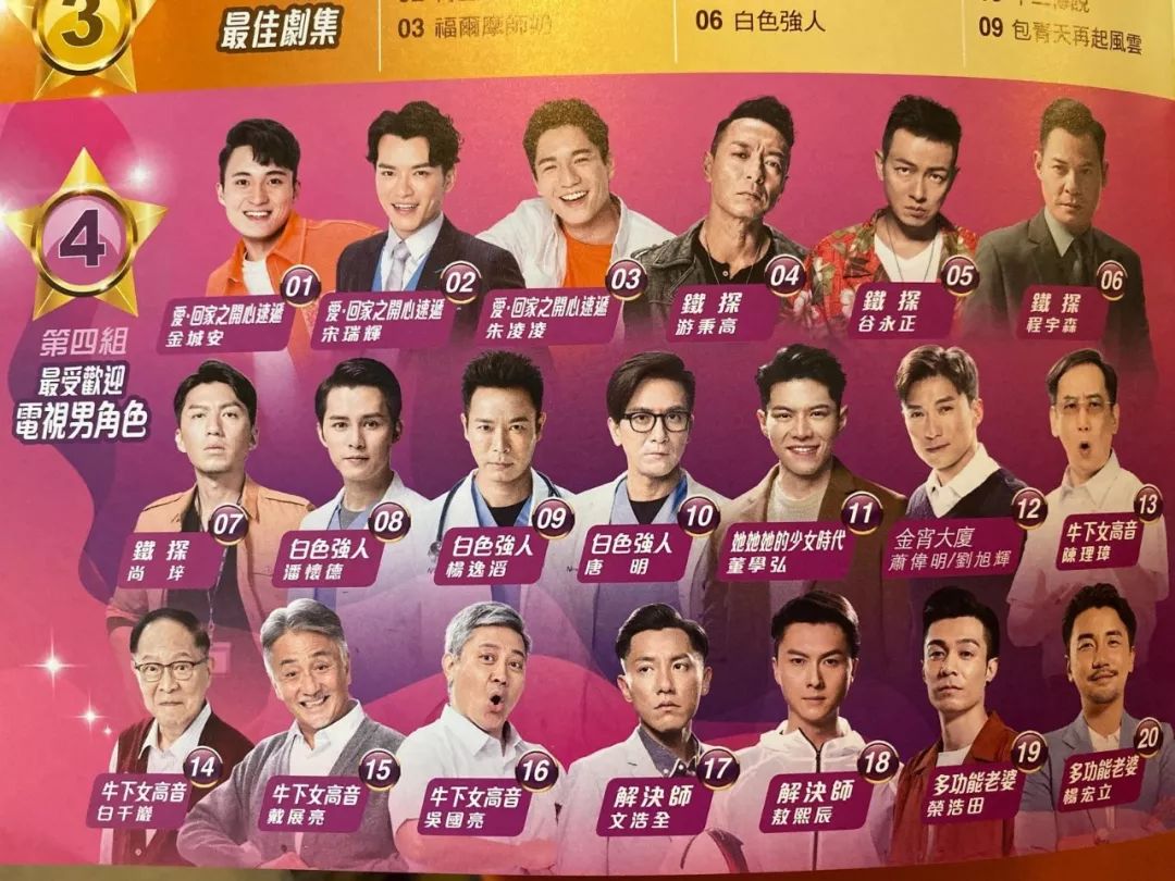 最佳男配角”,包括剧集《铁探》的许绍雄和梁竞徽,《白色强人》的蒋志光、《金宵大厦》的刘江、《解决师》的李天翔、黄嘉乐,以及《多功能老婆》的洪永城等。