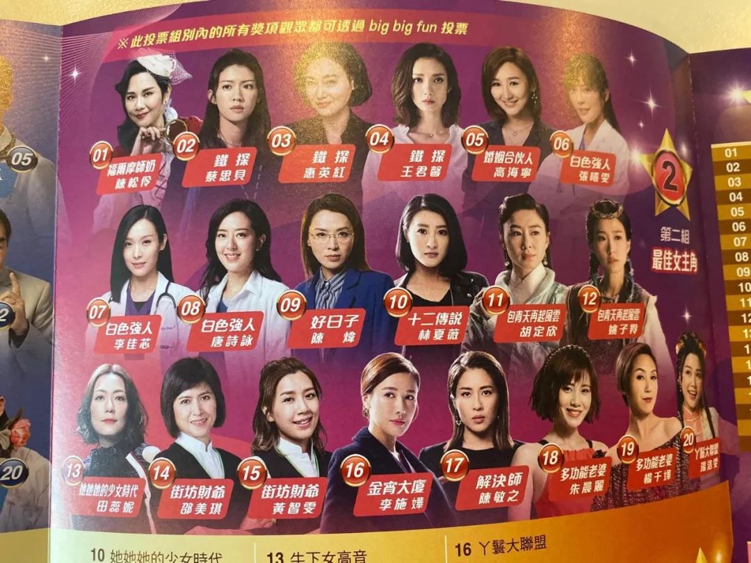 有《铁探》的蔡思贝、惠英红、王君馨,《白色强人》的李佳芯、唐诗咏及张曦雯,《多功能老婆》的杨千嬅及朱晨丽,还有的是大热门《金宵大厦》的李施嬅。