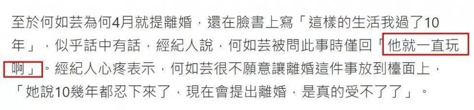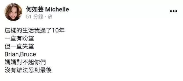虽然何如芸的经纪人透露,当下为了两个孩子,何如芸只想低调处理离婚事宜,也未曾直接透露离婚原因,但此前何如芸在个人社交平上曾坦诚,“这样的生活忍受了10年,一直有盼望,但一直失望”,字里行间更表达了对孩子的愧疚,没法再给他们一个完整的家庭,但自己实在没办法继续下去。