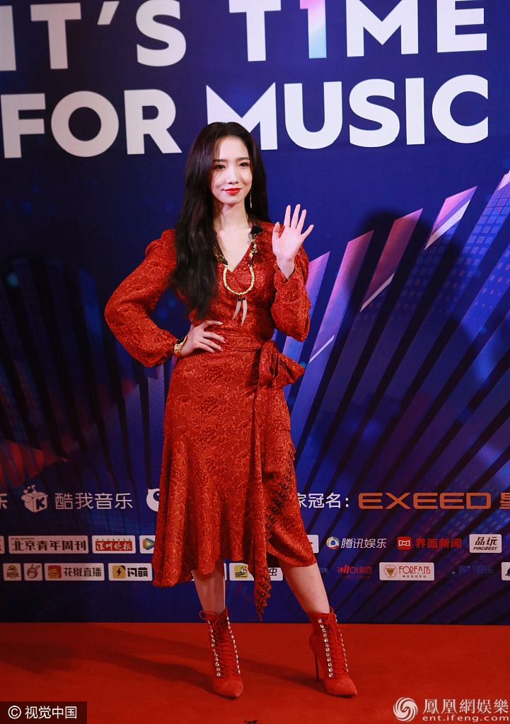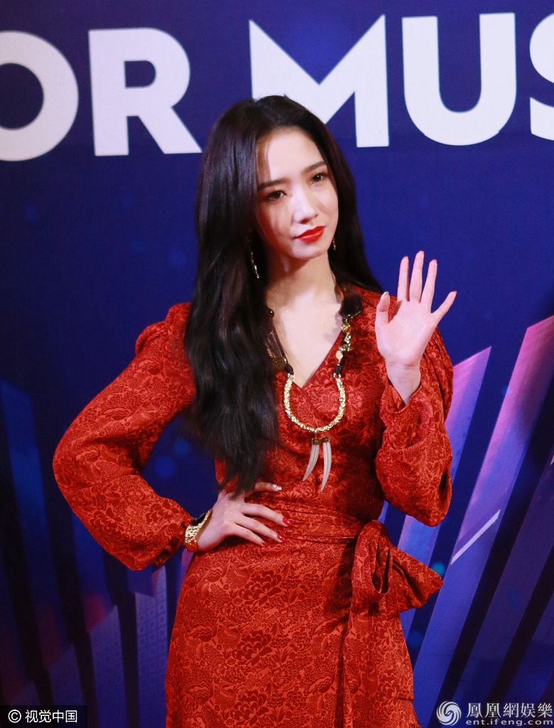 孟美岐身穿大红色长裙搭配波浪卷发,大走港风美艳动人。 图片来源:视觉中国/视觉中国
