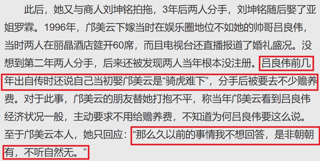 离婚之后,还被扒出两人其实没有注册的新闻。吕良伟也在自传中说娶邝美云是骑虎难下,还被分赡养费。但是邝美云朋友替她打抱不平,说邝美云并没有拿赡养费。邝美云则没有回应。小扒觉得,邝美云真的是个很有自己原则的人,可惜遇人不淑,实在很可惜。