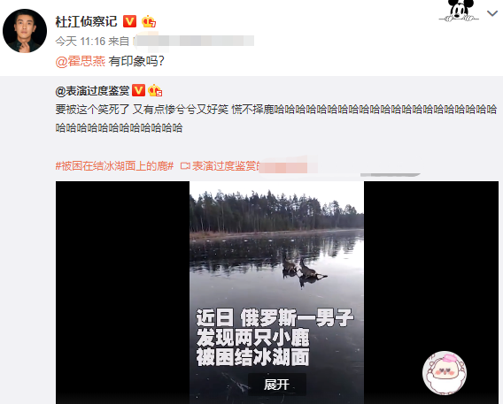 视频中,是两头小鹿由于湖面结冰,因为冰面湿滑,小鹿无法站立只能在湖面上不断干游,十分心酸搞笑。然而这个视频不禁让人想起,霍思燕此前在节目中自曝喝醉后在家里“游泳”的趣事,当时杜江不但未阻止,还在一旁边录视频边助威。