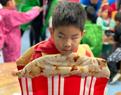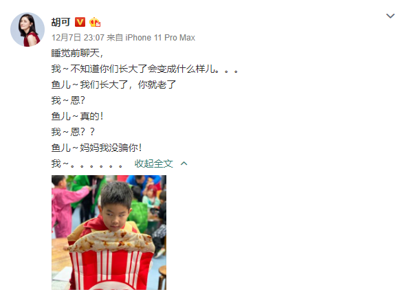 从这段对话不难看得出老母亲的无奈与哭笑不得,为此胡可还贴上了小鱼儿穿着爆米花的搞笑服装,翻着大白眼的照片“报复”儿子。