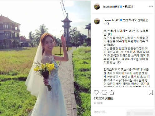 全慧彬发文称:“今年对我来说是非常特别的一年,在茫茫人海中遇到了我爱的人并约定共度此生,他有着优秀的人品,和我有着很深的共识,让我感受到巨大的幸福和安定感,所以决定结婚。”她还表示,突然结婚的消息连身边的朋友们都未告知,担心会对自己正在播出的作品造成困扰,同时也担心是否会对即将把她当成家人的家庭带来困扰,最后,对于自己的婚姻,她希望能够得到大家的支持。