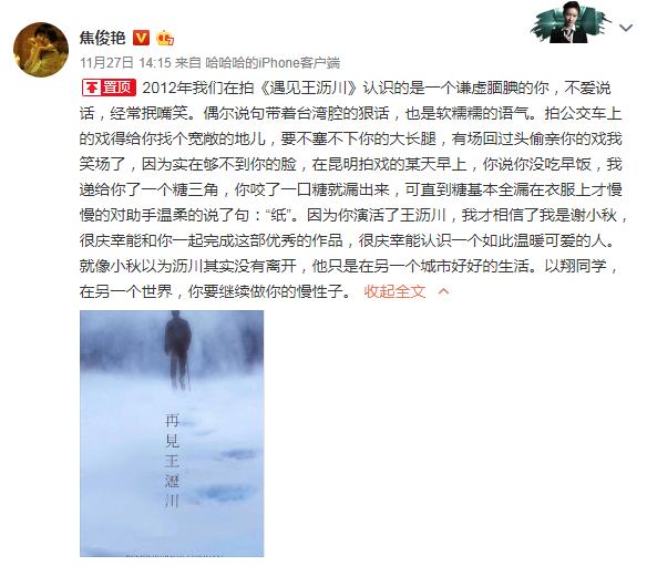 近日,有网友发现焦俊艳微博置顶了悼念高以翔的内容,文中回忆了两人在拍摄《遇见王沥川》时的往事,写道:“很庆幸能认识一个如此温暖可爱的人。就像小秋以为沥川其实没有离开,他只是在另一个城市好好的生活。以翔同学,在另一个世界,你要继续做你的慢性子。”