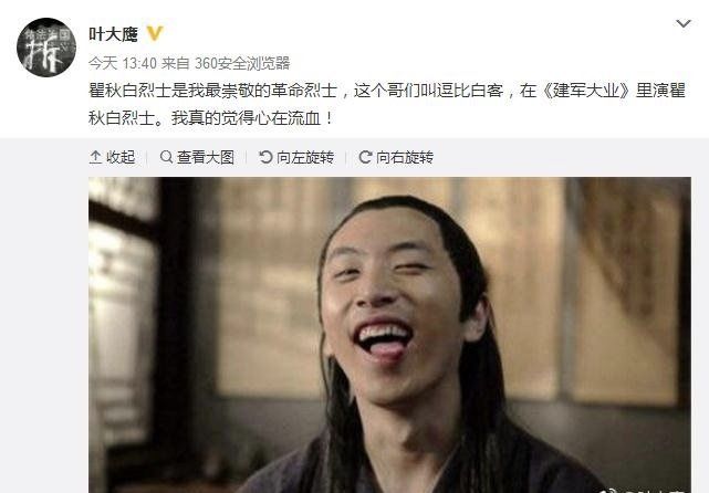 再是参演献礼片《建军大业》,这里还有一个小插曲,白客因为以往的搞笑形象被叶大鹰质疑演不了革命烈士。