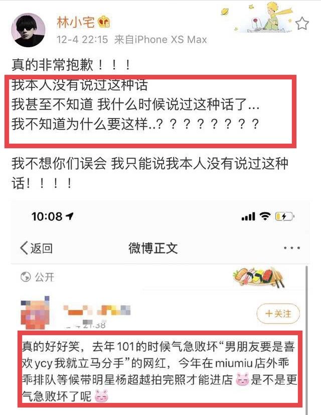 事情的起因是有网友认为林小宅曾经发博“diss过杨超越,对此林小宅急忙否认。
