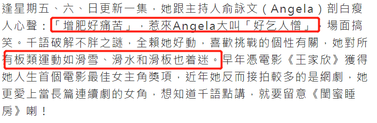 在节目中,吴千语还非常大方的分享了自己的不胖秘诀,她称自己是好动体质,还是非常喜欢挑战的个性,另外她还对所有有板的运动,如滑雪、滑板都非常着迷。