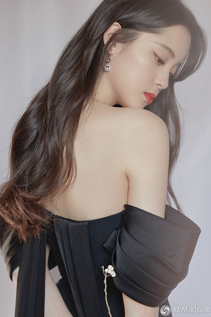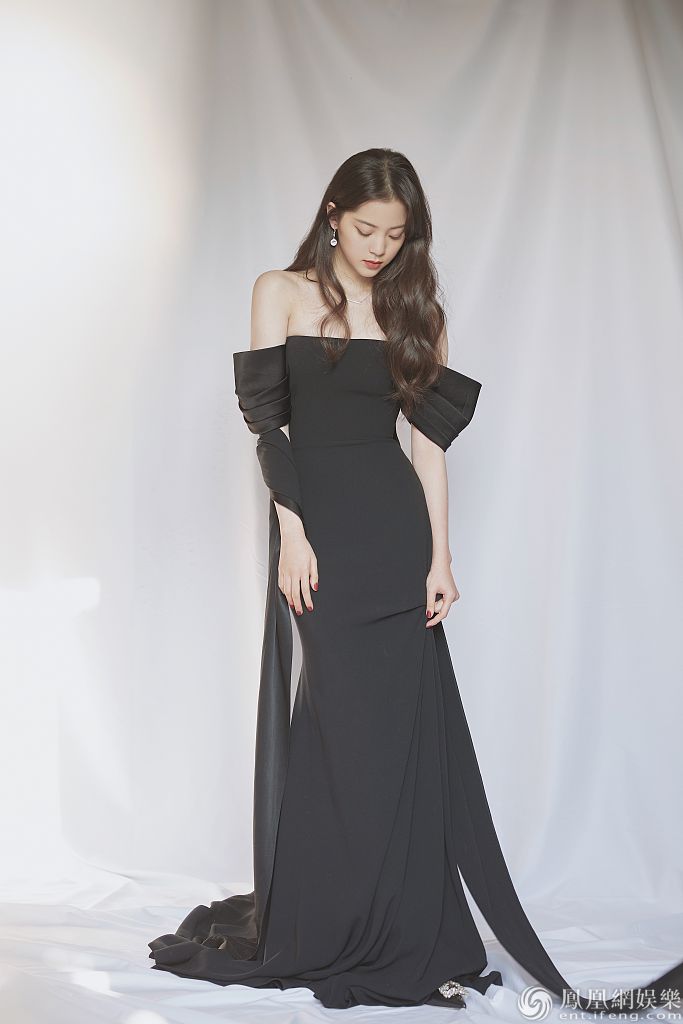 她身穿黑色露肩裙秀香肩美背和玲珑曲线。 图片来源:视觉中国/视觉中国