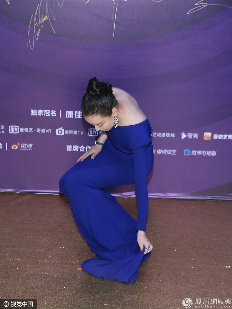 2019年12月6日,北京,2020尖叫之夜演唱会红毯。倪妮身穿一袭蓝裙摇曳生姿,弯腰理裙摆仍保持优雅姿态。不过倪姐这次失算了,万万没想到居然和尖叫之夜背景板撞色。倪姐不哭! 图片来源:视觉中国/视觉中国/视觉
