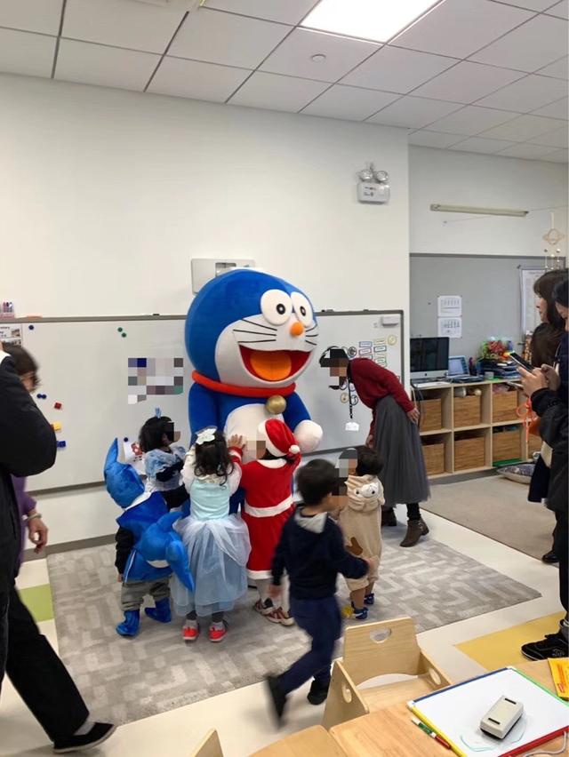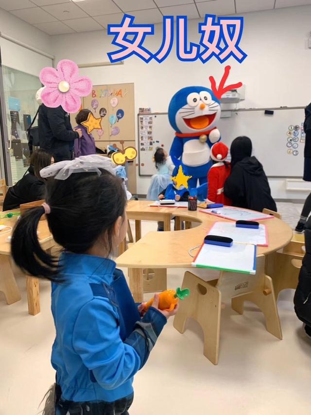 很显然穿着叮当猫套装的就是陈赫本赫了,他站在教室的小白板前,什么都没做,就围上来了一群小朋友,还有家长,深受大家的喜爱。