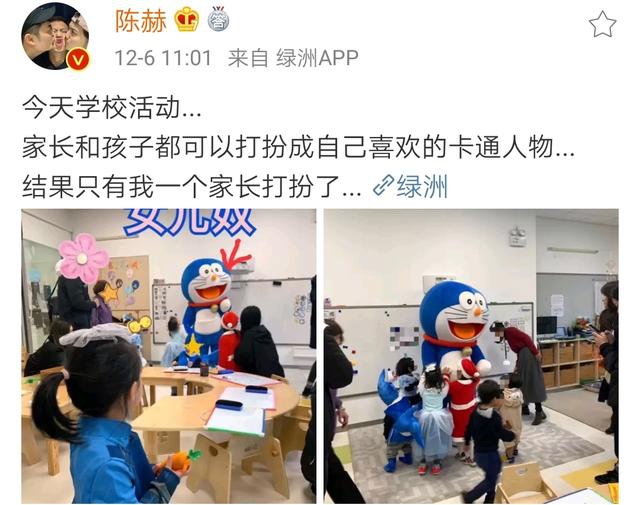 12月6日,陈赫分享了自己在女儿幼儿园里的照片,并配文说道:今天学校活动……家长和孩子都可以打扮成自己喜欢的卡通人物……结果只有我一个家长打扮了……