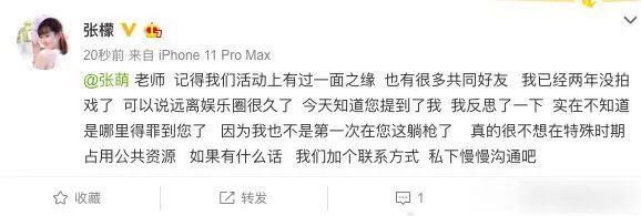 这次张萌回复网友:我是萌,不是檬!想必张檬的内心OS肯定是:有被冒犯到!于是发文回应此事,和张萌正面刚了起来,表示:@张萌老师,我和你有一面之缘,两年没拍戏了,不知道哪里得罪你了,因为我不是第一次在你这里躺枪了。