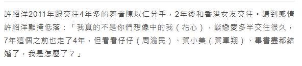 眼看着其他男星相继成家,自己却依旧单身,许绍洋难掩低落,称:“仔仔(周渝民)、贺小美(贺军翔)、毕书尽都结婚了,我是怎么了?”