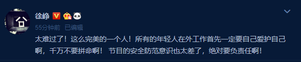 徐峥在文中说道:“太难过了!这么完美的一个人!所有的年轻人在外工作首先一定要自己爱护自己啊,千万不要拼命啊! 节目的安全防范意识也太差了,绝对要负责任啊! ”