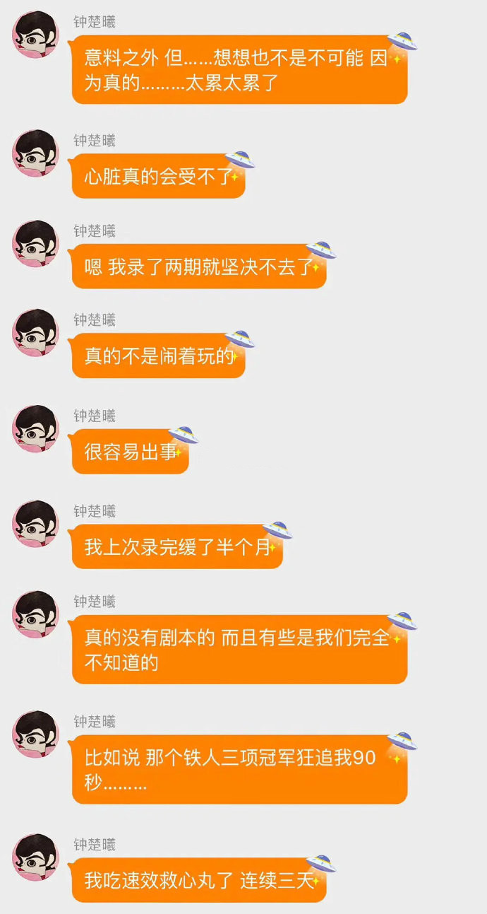 27日下午,有媒体曝出此前也曾参加《追我吧》录制的艺人钟楚曦对高以翔节目中猝死一事,她表示很意外,但也不是不可能因为(节目录制),她称自己当时录制了两期就坚决不去了,很累,而且很危险、很容易出事,并自曝自己自上次录制完后整整吃了三天速效救心丸才缓过来。
