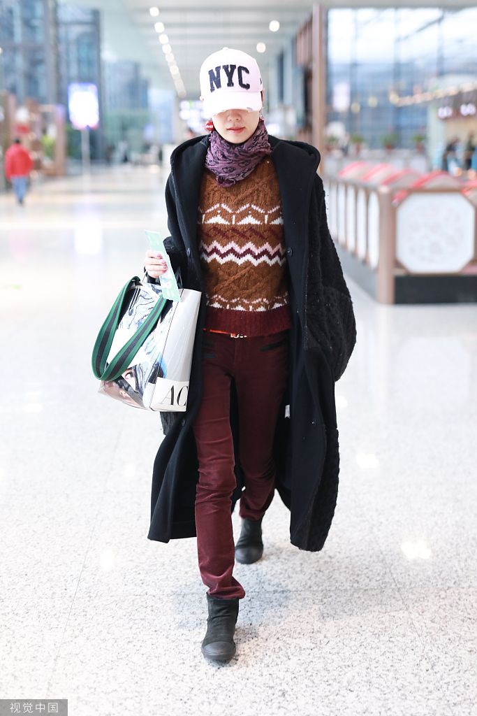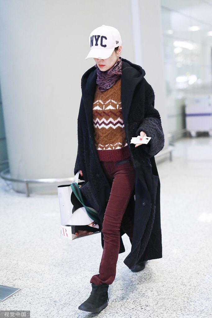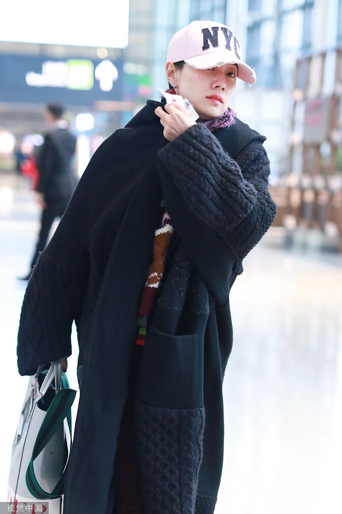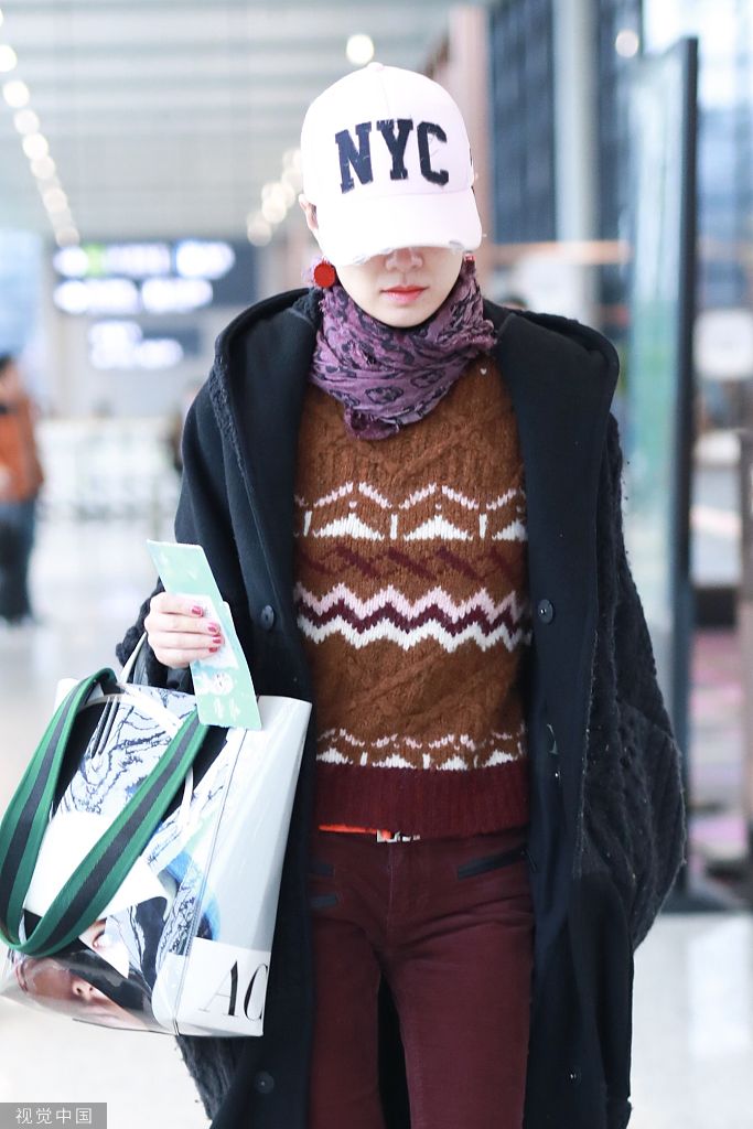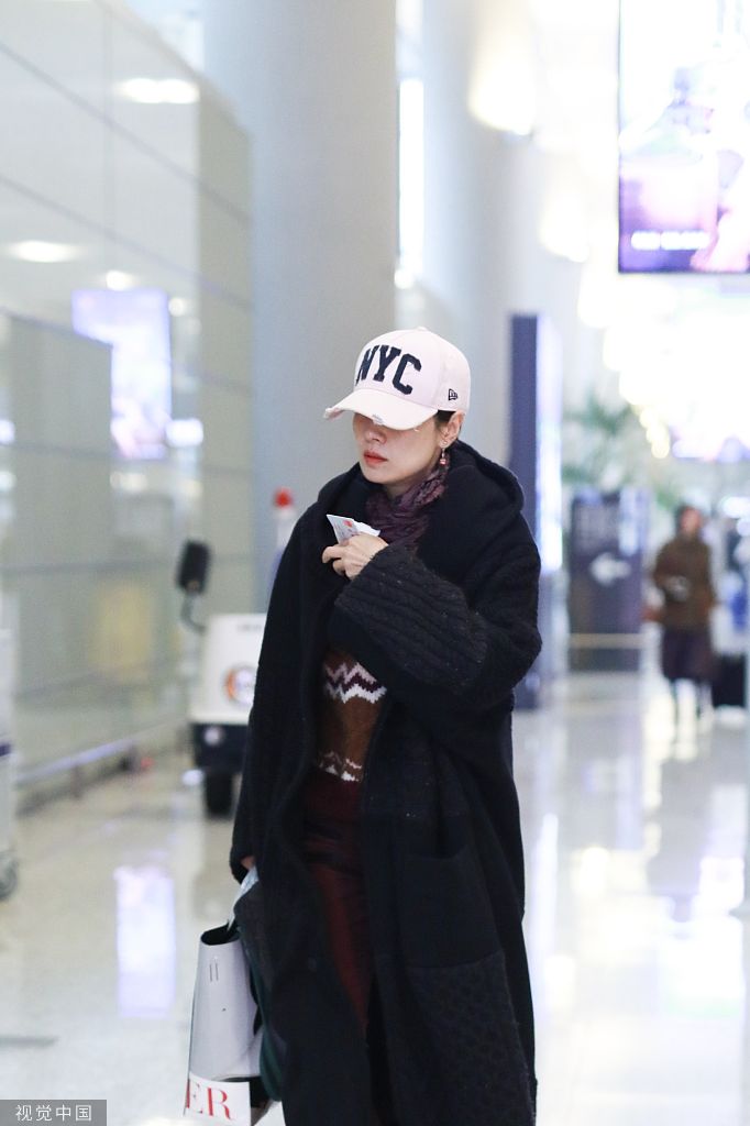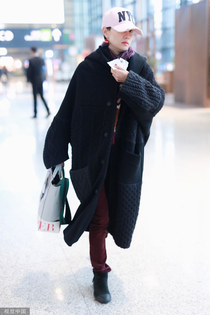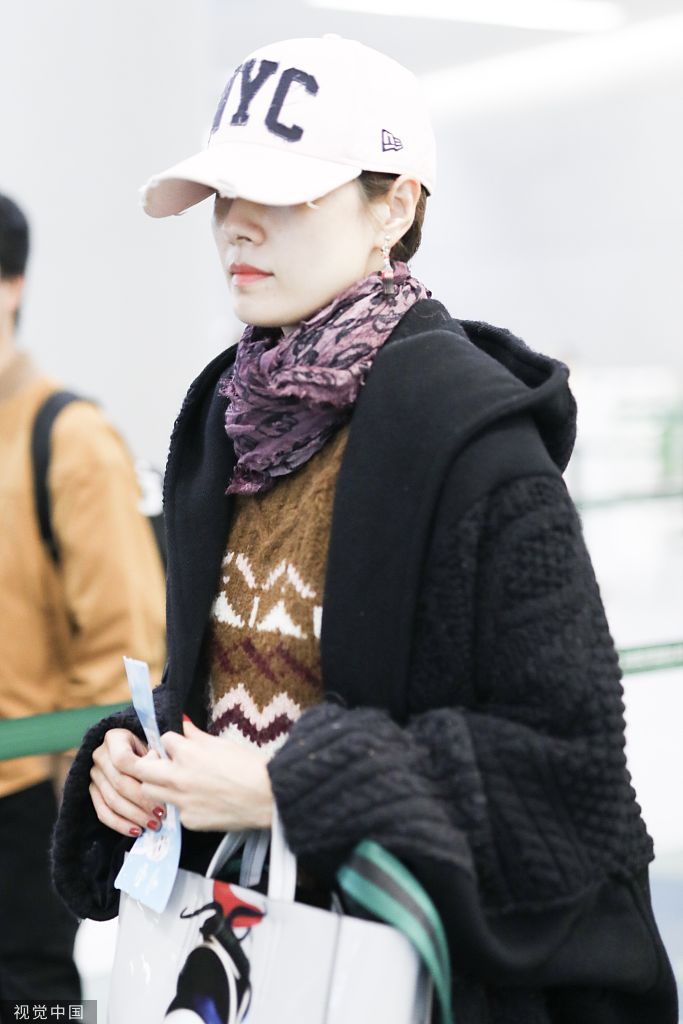 当天,马伊琍戴着白色棒球帽手提同色系包包,穿黑色毛衫围着紫色围巾御寒。