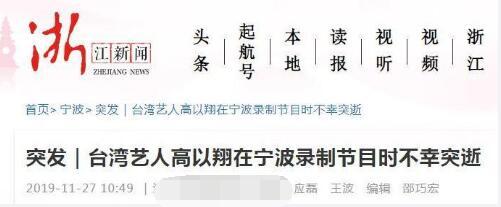 根据浙江新闻客户端证实,台湾艺人高以翔在宁波录制节目时发生意外,经过全力抢救无效去世。而内部人士更是透露了抢救现场的情况:一名演员意外送来要全力抢救。内科三线、方主任参与抢救,王院长来电关注,因患者送到抢救室时瞳孔放大到最边缘,虽全力救治2小时仍无法挽回。