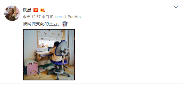 3月18日,姚晨晒出儿子土豆上网课的背影照,并配文:“被网课支配的土豆。”