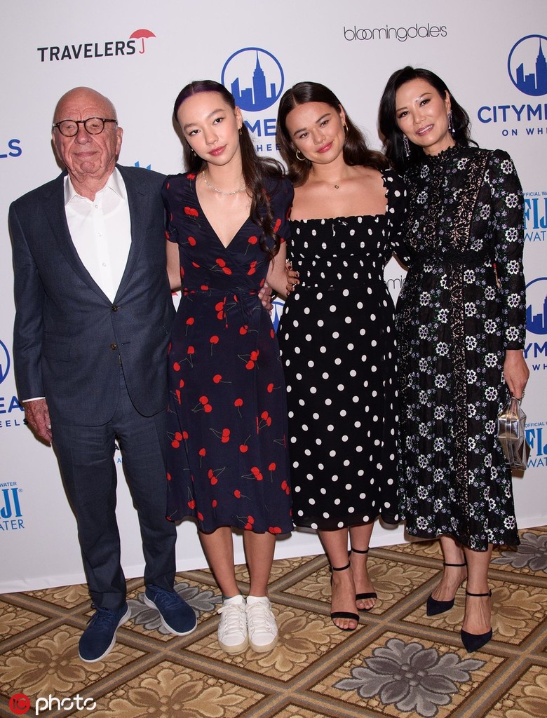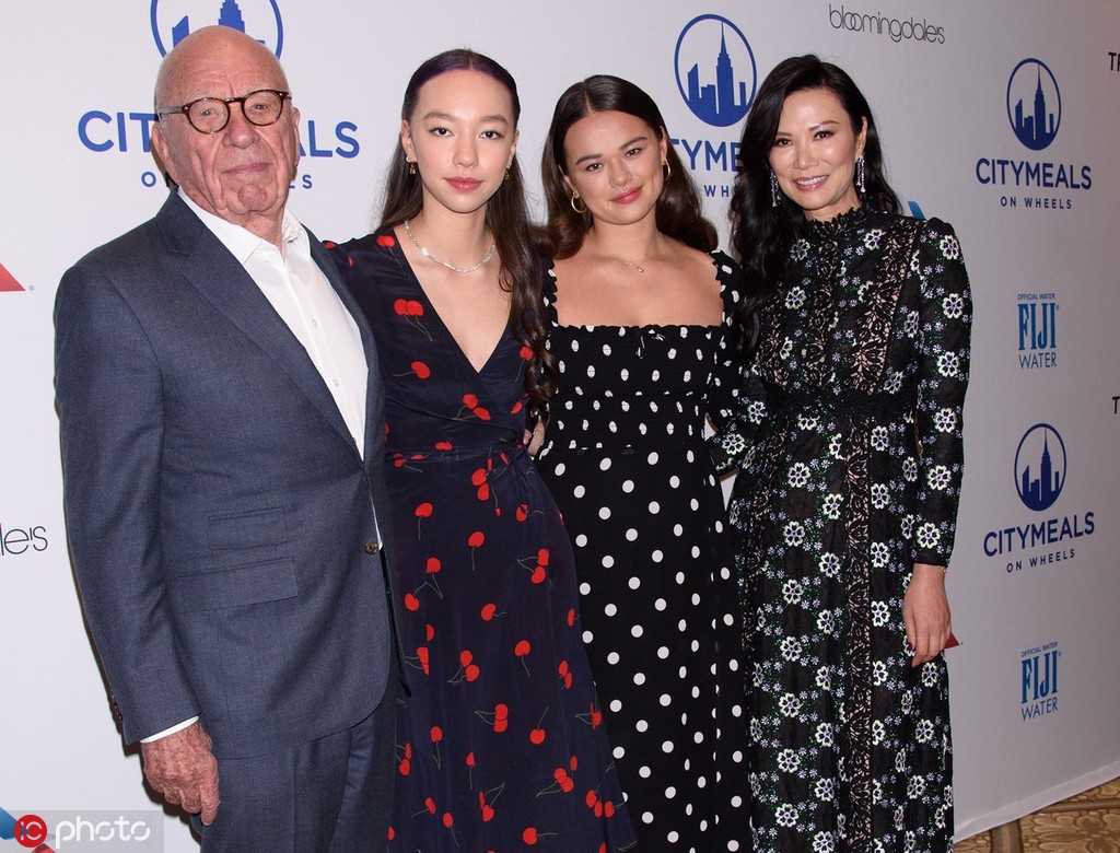 邓文迪与前夫默多克同框。两个女儿长相似妈妈,四人站在一起和谐有爱。