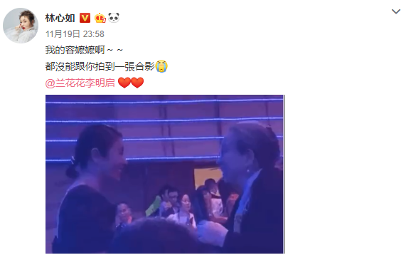 19日晚间,林心如在社交平台上晒出了与李明启老师的同框视频,并发文表示:“我的容嬷嬷啊~都沒能跟你拍到一张合影。”视频中,林心如身穿黑色露肩礼服优雅性感,李明启老师则穿着黑色外套,戴着丝巾亮相,两人在观众席简单寒暄笑容满面。